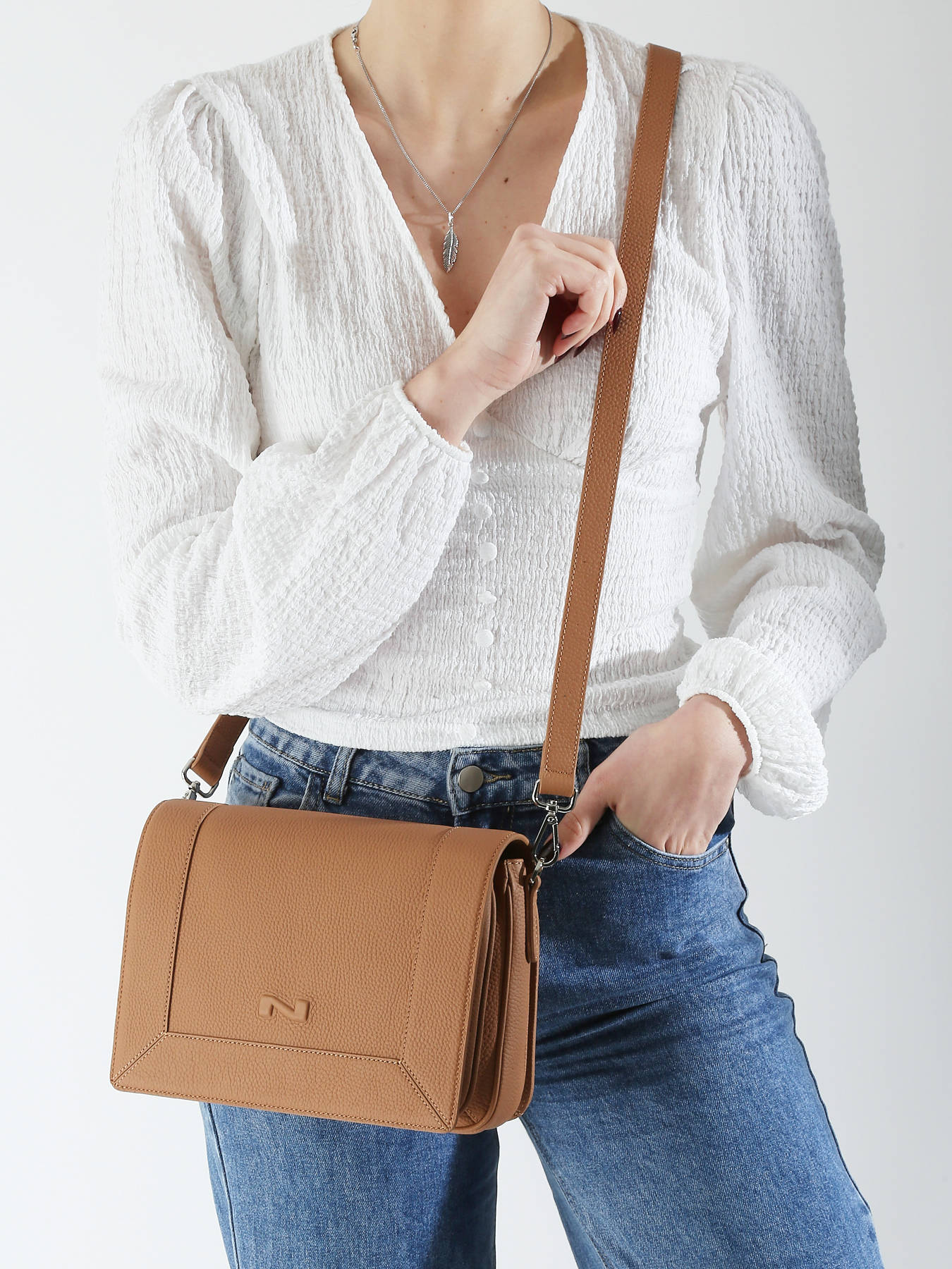 The NATHAN BAUME crossbody bag, crafted from calfskin leather, combines elegance and functionality. Featuring a magnetic flap closure, this bag ensures the safety of your belongings while providing quick and easy access. On the exterior, there is a back pocket for your essentials. The adjustable and removable strap allows for personalized crossbody wear, ensuring optimal comfort. Inside, you'll find a well-organized space with two dividers, one slip pocket, and three separate compartments to keep your belongings neatly arranged. This bag is the perfect accessory to add a sophisticated touch to your daily outfit.