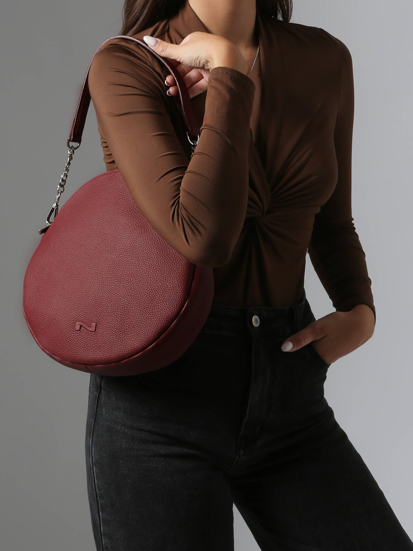 Optez pour un sac original avec le sac Anna signé Nathan Baume. Avec sa forme arrondie et ses détails en chaîne, ce sac s'inscrit parfaitement dans la tendance. Réalisé dans un beau cuir grainé, ce sac dispose d'une anse de 13,5 cm ainsi que d'une bandoulière réglable et amovible. Son compartiment zippé est doté de 2 poches simples ainsi qu'une poche éclair, idéal pour accueillir vos essentiels tout au long de la journée. A accorder avec une tenue rock ou classique, ce sac est un intemporel.